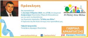 Σας προσκαλούμε τη Δευτέρα 4 Μαρτίου 2019, στις 17:30, στο Δημοτικό Αναψυκτήριο Ηλιούπολης (Ύδρας & Μνησικλέους) για την κοπή της βασιλόπιτας της δημοτικής παράταξης «Η Πόλη που θέλω». Η παρουσία σας θα δώσει δύναμη στην προσπάθειά μας. Γαβριήλ Αραμπατζής Υποψήφιος Δήμαρχος Ηλιούπολης
